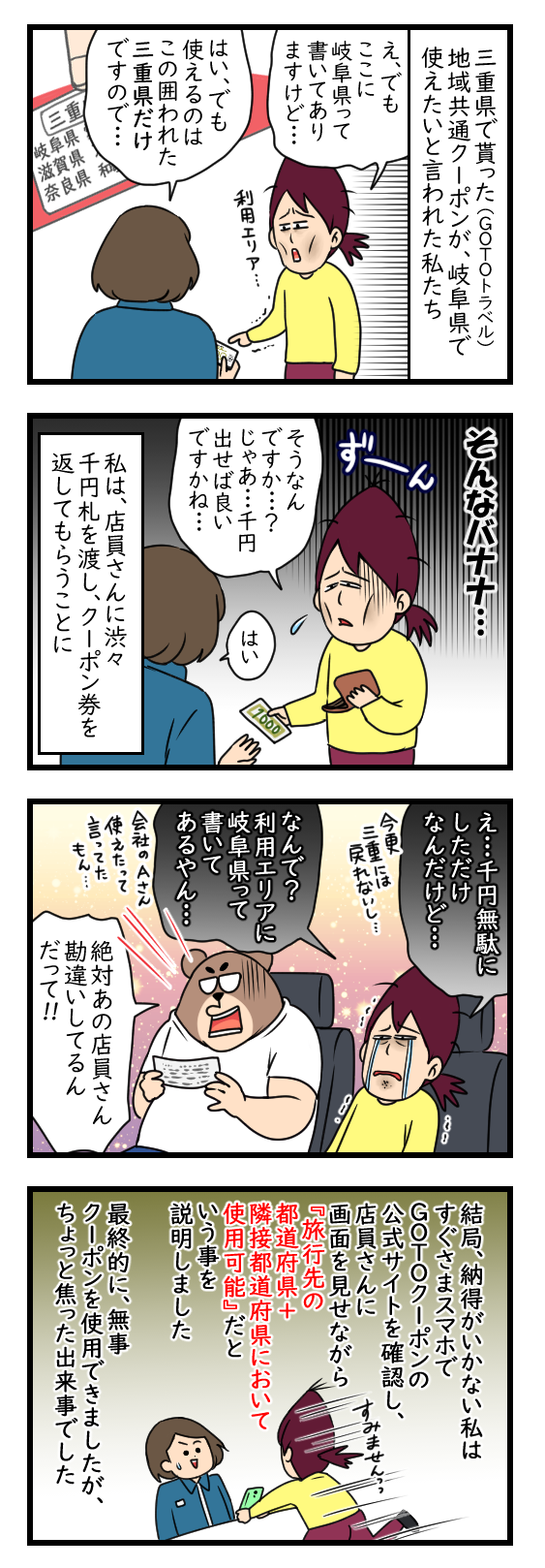 GOTOのクーポンで焦った話-後編- 2020年10月31日 21:30 ▼昨日の記事の続きとなります▼ 店員さん、店の奥に行って誰かに確認してきたようなんですが、戻ってきた時もいまいち納得していない感じでした。もうねぇ…発行した都道府県をわざわざ丸で囲むからややこしくなるんですよ!笑まぁ、最終的にはクーポン券が使えたから良かった!▼過去記事も読んでみる?▼▼人気ブログランキングに登録中です▼押していただけるとランキングに反映されます(^^)よろしくお願い致します!絵日記ランキング スポンサードリンク 「日常」カテゴリの最新記事 タグ :#GOTOトラベル#クーポン券 < 前の記事次の記事 > コメント コメント一覧 (2) 1. ミント 2020年11月01日 01:13 良かった〜!😆🎶 私も納得できなかったらガッツリ調べてもう一度果敢に攻めるタイプ(笑) ちゃんと店員さん芋子さんに謝ってくれたかな?? 時間も無駄になったし対応にもモヤモヤしちゃうよね💣 まぁ結果オーライだけど。 芋子さんお疲れ様!(๑•̀ㅂ•́)و✧グッ♪ 0 芋 がしました 2. 芋子 2020年11月01日 21:04 >>ミント様 本当に良かったです~! 正しいことなら果敢に攻めていかないと損しちゃいますよね!! それが…店員さんからはあまり 申し訳ないという気持ちは伝わってきませんでしたね(;'∀') やっぱり完全に納得してなかったからでしょうか?笑 ありがとうございます! ブログネタにも出来たので、結果オーライですね😂 0 芋 がしました コメントフォーム 名前 コメント 記事の評価 リセット リセット 顔 星 情報を記憶 コメントを投稿する