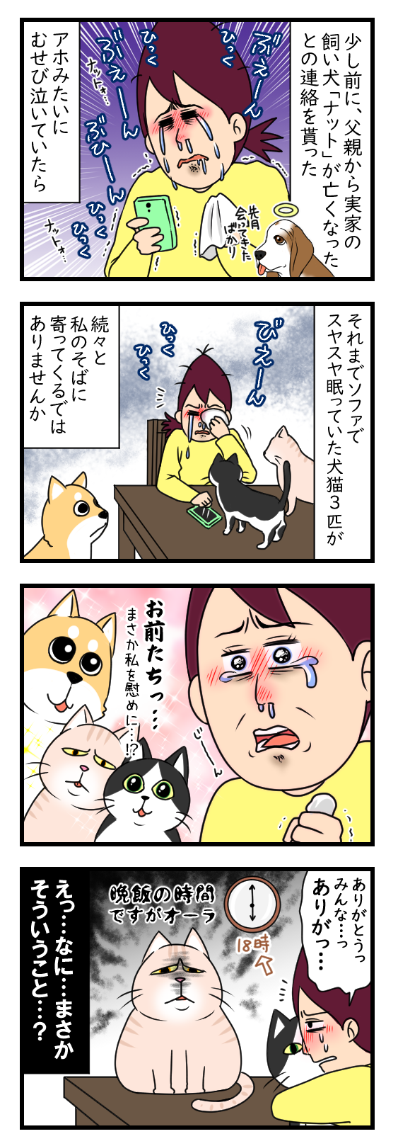 【犬猫】別れと優しさと腹時計の正確さ 2020年11月18日 21:45 違うよね…?▼先月実家の犬に会ってきた時の記事▼ 先月会った時もナットは少し調子が悪そうだったのですが、まさかこんなに早く逝ってしまうなんて思ってもいなくてショックでした。…ところで、ブログサボりまくってしまいました。すみませんまたボチボチ描いていきます!▼過去記事も読んでみる?▼▼人気ブログランキングに登録中です▼押していただけるとランキングに反映されます(^^)よろしくお願い致します!絵日記ランキング スポンサードリンク 「ペット」カテゴリの最新記事 タグ :#ナット#ペット < 前の記事次の記事 > コメント コメント一覧 (2) 1. ミント 2020年11月19日 00:16 久々の更新嬉しい〜っと思ったら… 😭悲しみっ 家族だからね、寂しいですよね… もう少しやれることがあったのに…とか( ´Д`) 切ないですね。 どうしてもああしてれば、こうしてればが出てきちゃう。 芋子さんがちゃんと泣ける場所があって良かったわ✨ 私、遠方の祖父の葬式に行けなかったことがあって。 元旦那が心無い人だったから行かせてもらえなかったんよ。 今振り返れば結婚1年目でおさらばしとくべきだった(^^)💧(笑) ってなんの話やねん😅 芋子さん号泣してたとき、ちゃんと寄り添ってくれたね😆🎶カワイイコたち✨ 0 芋 がしました 2. 芋子 2020年11月19日 21:38 >>ミント様 悲しみっな記事になっちゃいました💦 少し前に、実家へ行って会っておいて本当に良かったです。 そうなんですよね、そういう後悔はいつも出てきてしまいますね。 ええっ、お葬式に行かせてもらえなかったんですか? どういうことなんだろう、元旦那さんは一体何を考えて…💦 ミントさんもずっと心残りですよね。 でもきっとお祖父さんはミントさんの優しさを分かって下さってるだろうし、 ミントさんの気持ちも伝わっていると思います!✨ 犬猫が寄ってきてくれた時は 予想外でビックリしましたが、嬉しかったですね~(*´ω`*) 0 芋 がしました コメントフォーム 名前 コメント 記事の評価 リセット リセット 顔 星 情報を記憶 コメントを投稿する